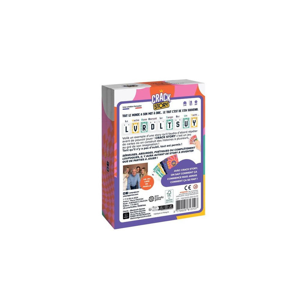 Crack Story est un jeu qui reconnecte et réunit toutes les générations. Des parties rapides et fun, qu’on a envie de relancer. Des règles simples à comprendre et à expliquer. De la créativité, des histoires loufoques, des coups bas et surtout des fous rires garantis !