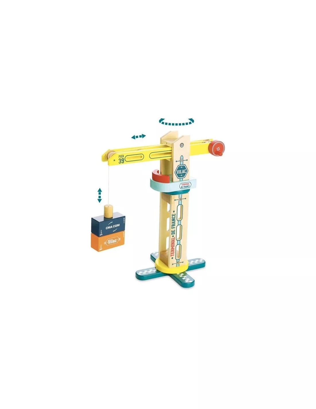 Découvrez la grue de Docker Vilacity de Vilac, une grue colorée et articulée pour les enfants, dès 3 ans.