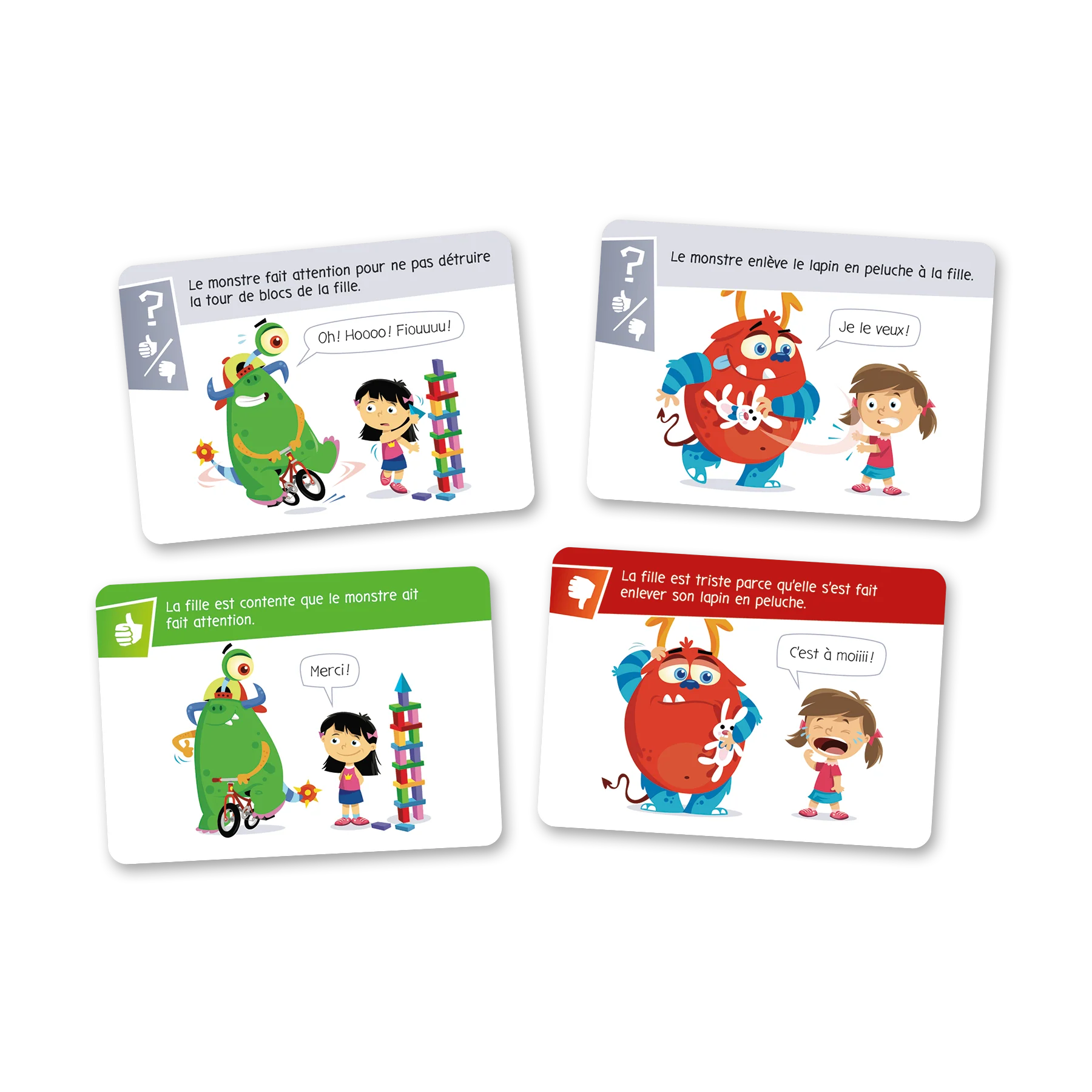 Le fait que le jeu met en scène des monstres ajoute un aspect humoristique à l’apprentissage. En effet, les monstres sont souvent taquins et prennent typiquement un malin plaisir à transgresser les règles. Ainsi, les enfants tentent d’enseigner aux monstres à respecter les règles sociales dans le rire et le plaisir. Ils n’ont pas l’impression qu’ils doivent eux-mêmes développer leurs habiletés sociales, ce qui peut être plus motivant pour eux.