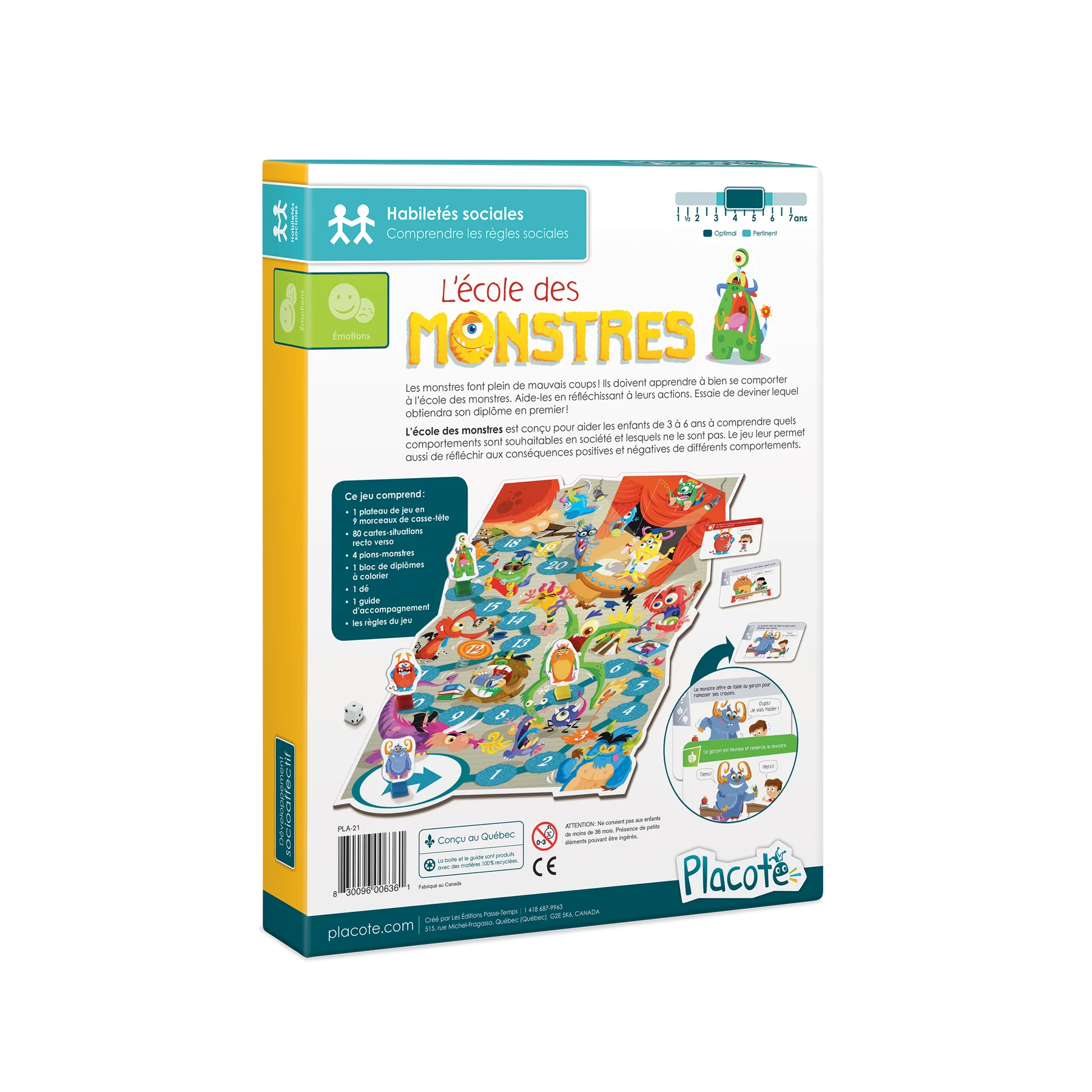 L’école des monstres est conçu pour aider les enfants de 3 à 6 ans à comprendre quels comportements sont souhaitables en société et lesquels ne le sont pas. Le jeu leur permet aussi de réfléchir aux conséquences positives et négatives de différents comportements.