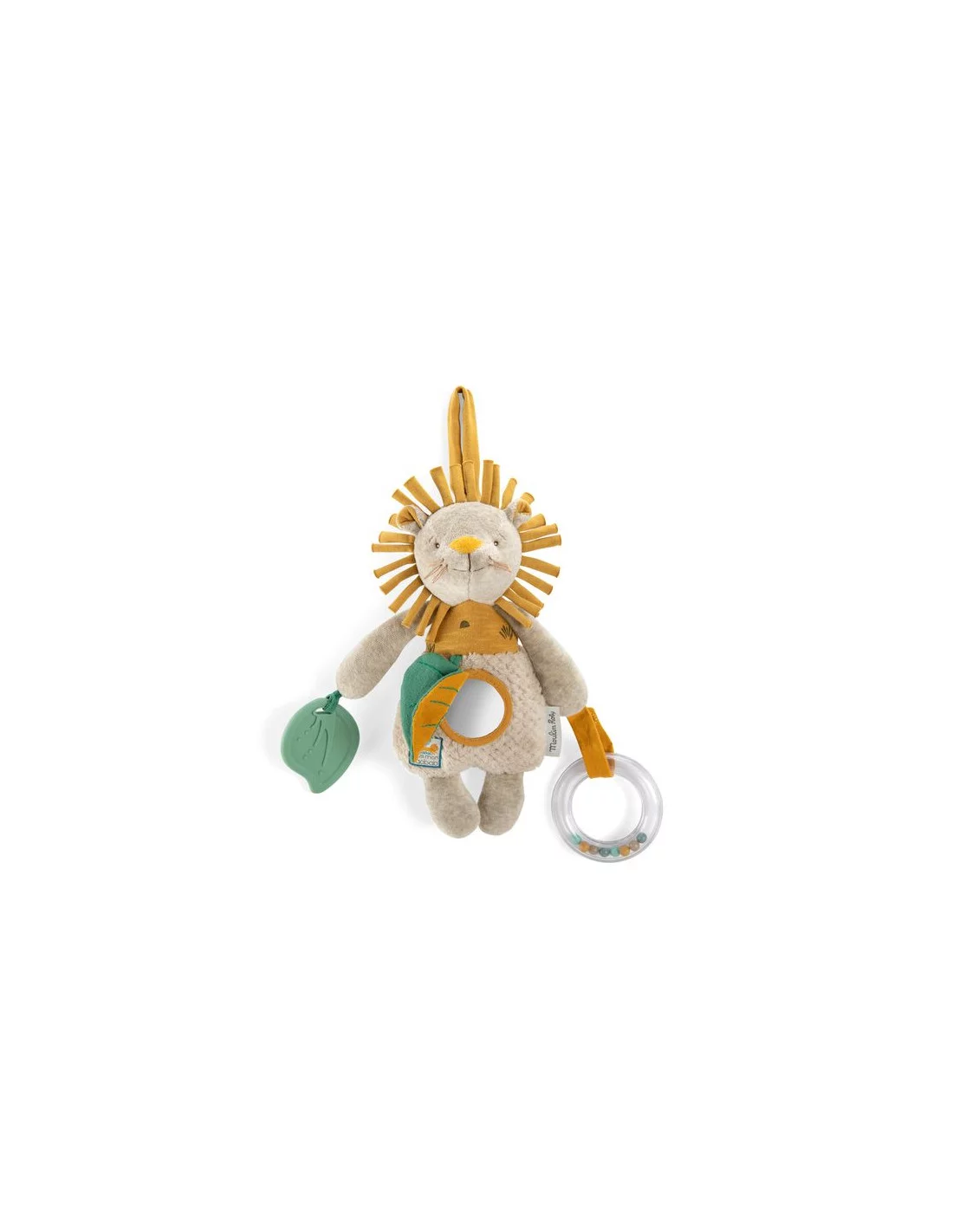 Découvrez le lion d’activités de la collection Sous mon baobab de Moulin Roty, un jouet d’éveil à suspendre aux couleurs de la savane qui propose différentes activités avec dans son ventre une clochette qui fait glong et un miroir dissimulé.
