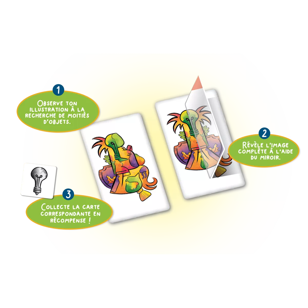Découvrez qui vous attend de l’autre côté du miroir ! Transformez les moitiés d’image en un tout à l’aide des cartes miroirs : une ligne courbe se révèle être une aubergine, et un drôle de gribouillis est en fait un palmier géant.
