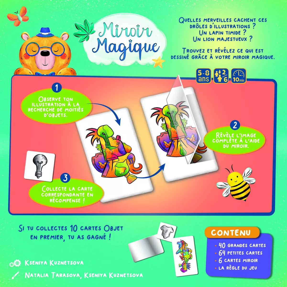 Miroir Magique est un jeu pour des enfants dès 5 ans. Observez de curieuses images grâce à un miroir magique qui révélera une image cachée !