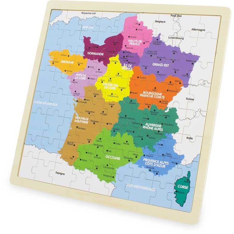 - Puzzle en bois avec 72 pièces pour reproduire la carte de la France avec les régions et les principales villes.