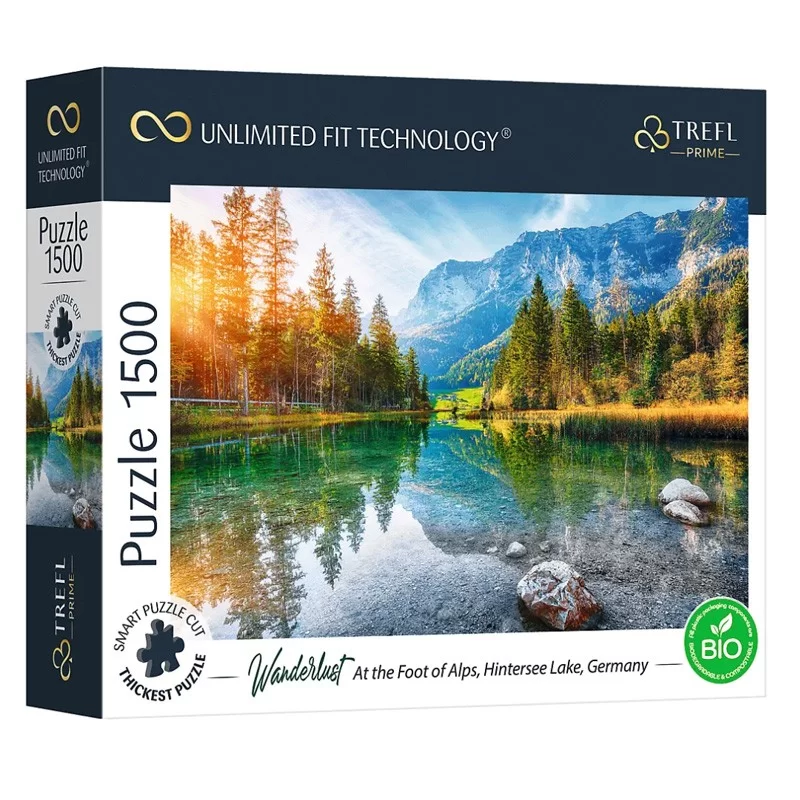 Les puzzles de la série Trefl Prime Unlimited Fit Technology , composés de 1 500 pièces, sont dédiés aux vrais amateurs de puzzles. Le puzzle montre le lac Hintersee situé en Allemagne, au pied des Alpes . Après arrangement, une image de dimensions 850×580 mm sera créée.